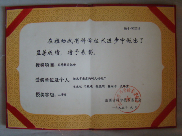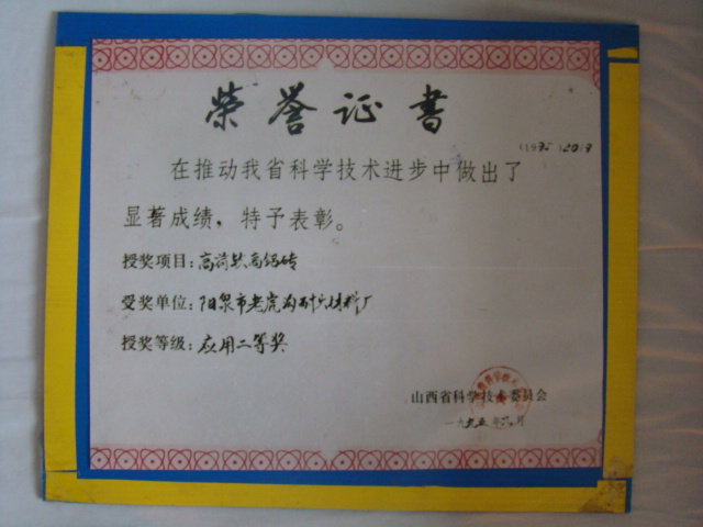 熱風(fēng)爐用低蠕變高鋁磚、高荷軟高鋁磚獲省科技進(jìn)步二等獎(jiǎng),微膨脹高鋁磚列入火炬計(jì)劃項(xiàng)目,炭素焙燒爐用特種高鋁磚已批準(zhǔn)國家專利